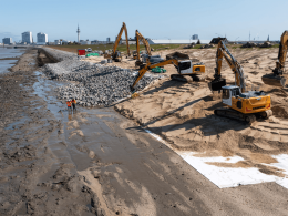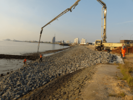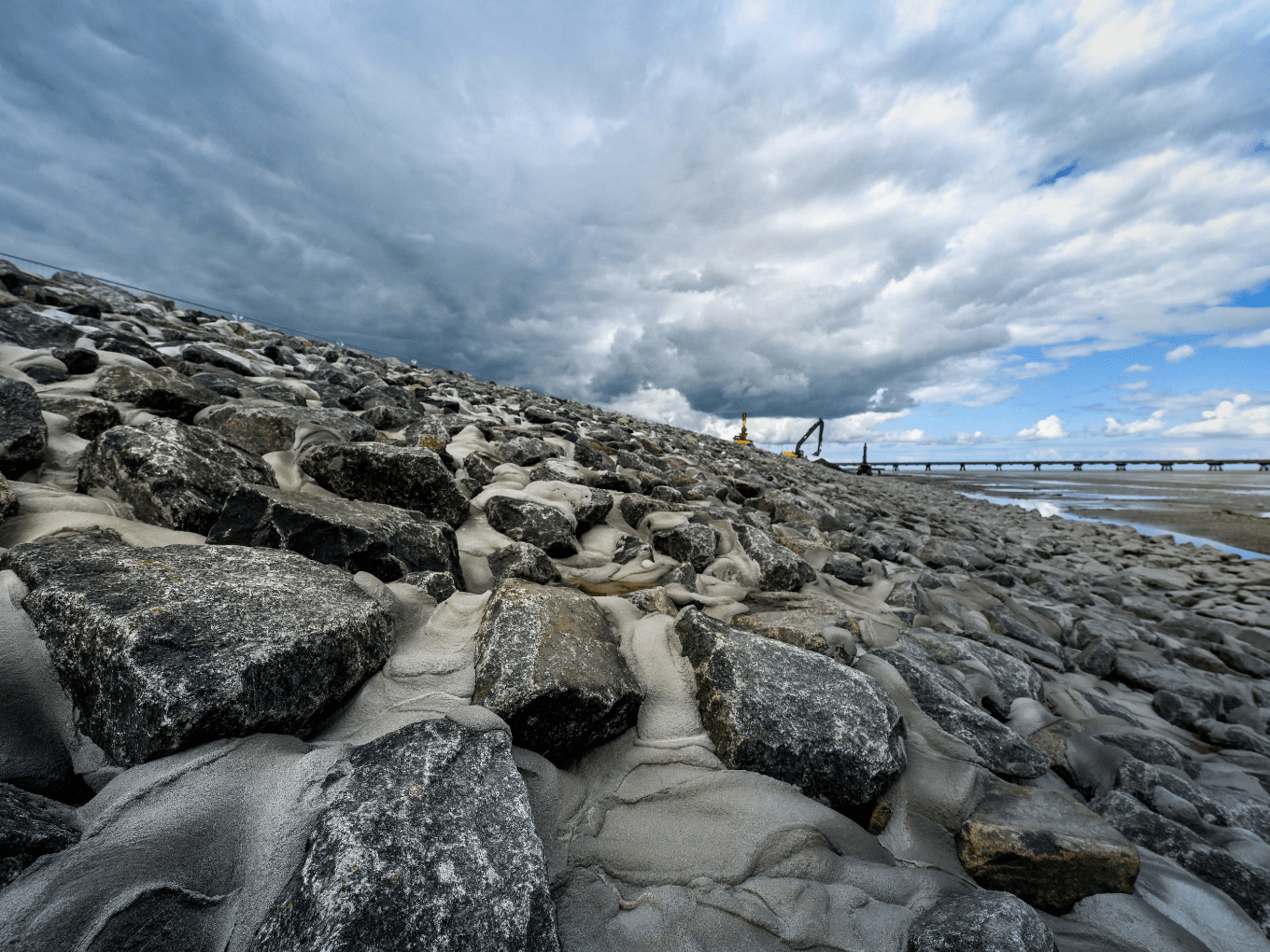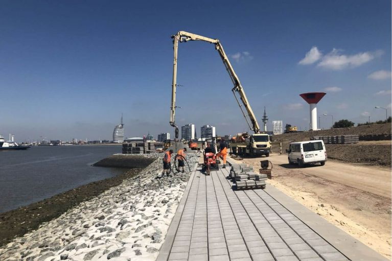 In diesem zum Teil tideabhängigen Projekt sind wir zuständig für die Verklammerung auf einer Fläche von rund 17.400 Quadratmetern. Ebenso wie bei den gewünschten 2.200 Quadratmetern Vollverguss arbeiten wir hier über Wasser.